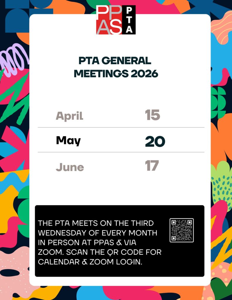 Don’t miss the next general PTA meeting – join us in person in the PPAS Library or on Zoom for all the latest updates. See previous meeting minutes here.