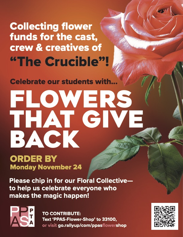 We’re inviting families of cast, crew, and creatives to help us celebrate our students’ hard work and enthusiasm that’s gone into “The Crucible.” We hope other generous supporters will purchase flowers for multiple students so that no one is left out.