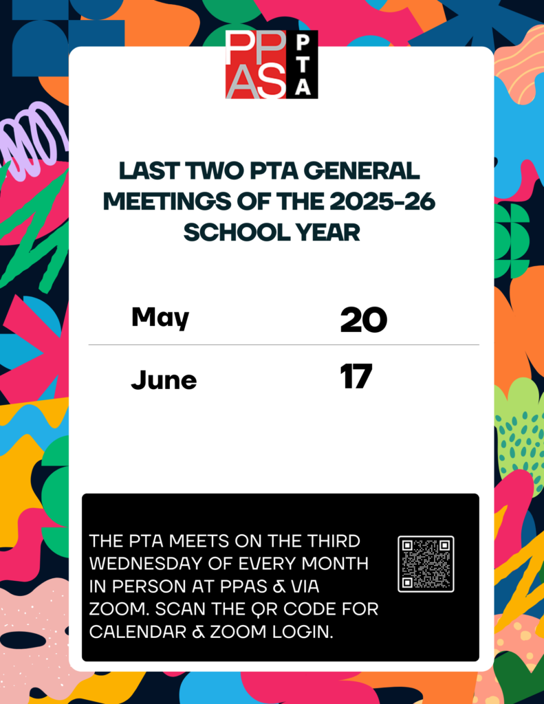 Don’t miss the next general PTA meeting – join us in person in the PPAS Library or on Zoom for all the latest updates. See previous meeting minutes here.