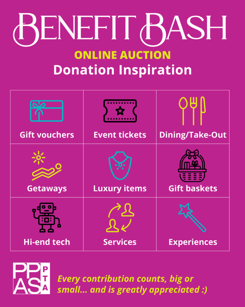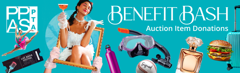 Please help us succeed in our PPAS PTA Benefit Bash fundraising goals by gathering donations for our silent auction! The silent auction will be available online by April 19 and at our Benefit Bash on Sunday, May 3. All auction proceeds go directly toward elevating the arts experience for every PPAS student.